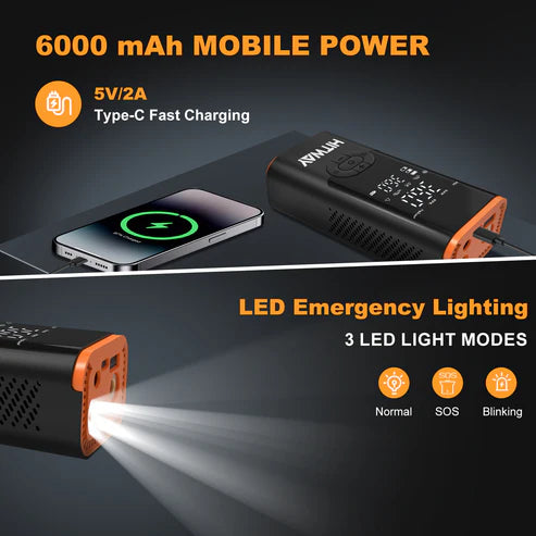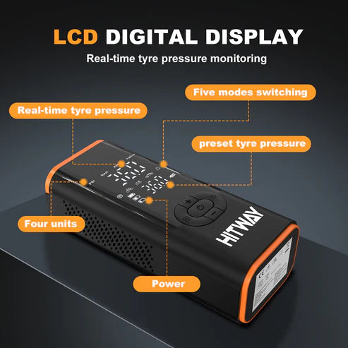 The HITWAY portable air pump offers powerful performance with a maximum pressure of 150 PSI, making it perfect for inflating car tires, bikes, and sports equipment quickly and efficiently. Its compact design, long-lasting battery, and smart features ensure convenience and safety for all your inflation needs, whether at home or on the go.