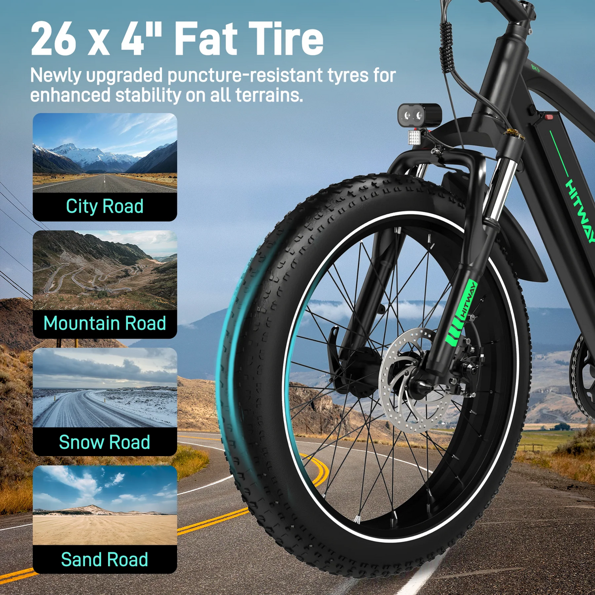 Designed with oversized 26×4.0-inch pneumatic tyres, a front suspension fork, and a shock-absorbing saddle, the BK9S is built to handle any surface—including snow, sand, gravel, and asphalt. These features work together to absorb bumps and ensure a stable, smooth ride on any adventure.