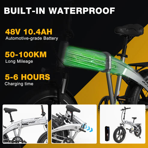 This powerful 48V 10.4Ah battery is concealed within the bike frame, offering enhanced security and a sleek appearance. Simply fold the bike to remove the battery for easy charging, providing long-lasting power for extended rides without the need to move the entire bike.